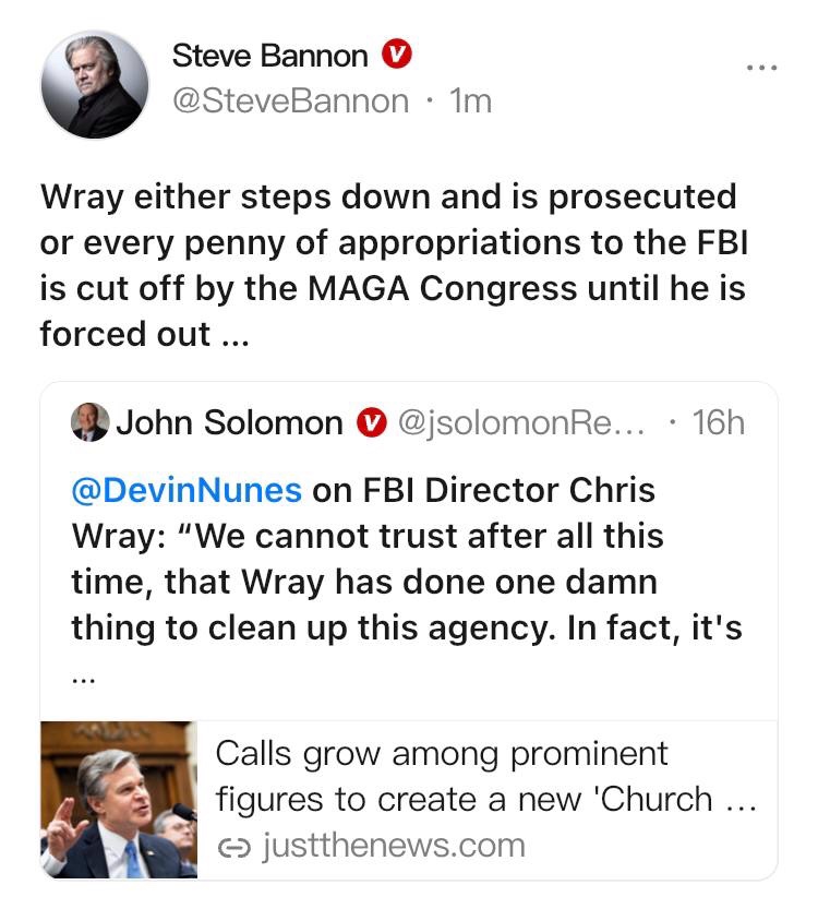 «No podemos confiar después de todo este tiempo, en que Wray ha hecho una maldita cosa para limpiar esta agencia», dijo Nunes. «De hecho, ha empeorado. El pueblo estadounidense sabe que es peor». https://t.me/QAnons_Espana