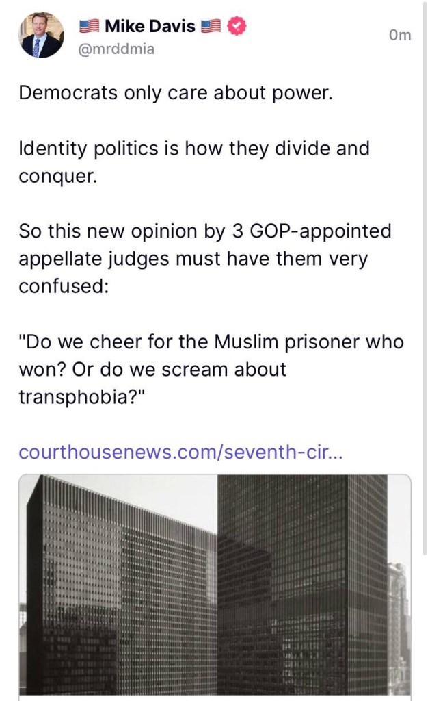 El Séptimo Circuito falló a favor de un recluso musulmán en un caso que enfrentó las convicciones religiosas del recluso contra el derecho de un guardia de prisión transgénero a ser tratado igual que sus colegas cisgénero. https://t.me/QAnons_Espana