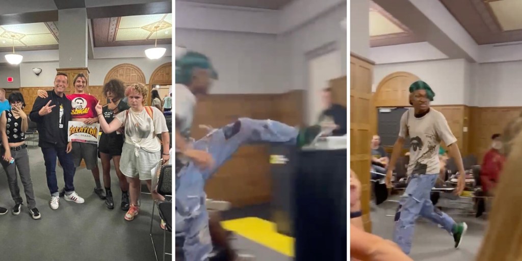 Johnson estaba hablando sobre el tema de los memes cuando su presentación fue interrumpida por un joven que llevaba un pañuelo verde en la cabeza. Las imágenes muestran al hombre reaccionando a un meme de Kamala Harris gritando «¡Racista * ss b * tch! ¡F * ck you!» después de patear y destruir un proyector.