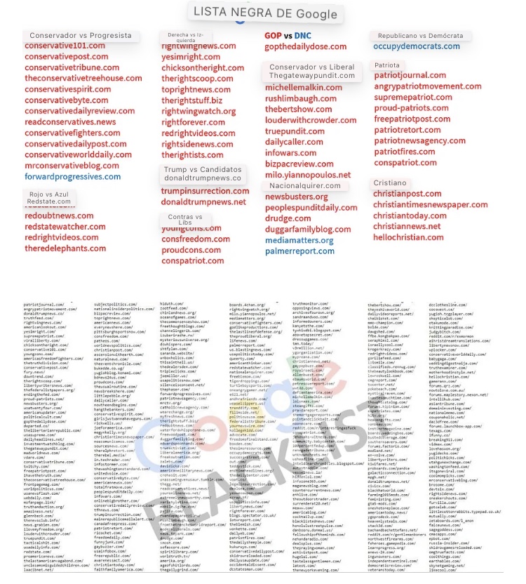 Por ejemplo, Daily Caller, Western Journal, RedState, Gateway Pundit, Steven Crowder, Michelle Malkin, Glenn Beck y Rush Limbaugh, entre otros sitios web conservadores, estuvieron en la lista negra.