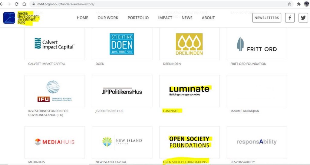 Desplazamiento: está registrado en los EE. UU. Obtiene fondos directamente del grupo Omidyar e indirectamente de Soros y Omidyar a través de otra ONG MDIF. MDIF está financiado por la red Soros y Omidyar (Luminate)