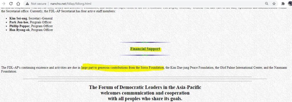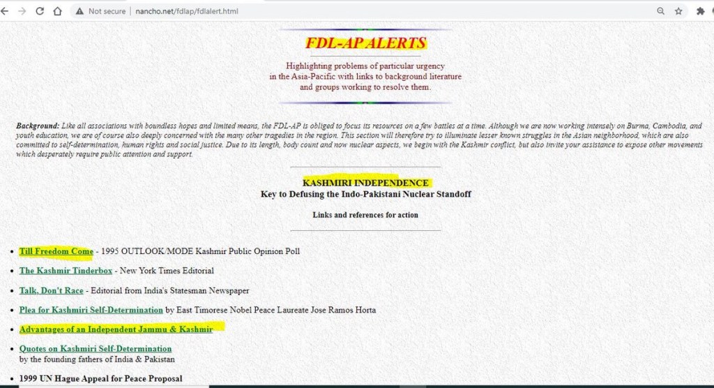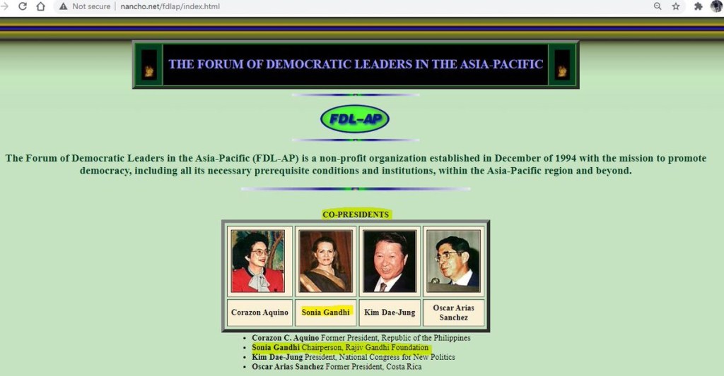 En 1994 hubo una ONG «FDL-AP». Esta ONG tiene un objetivo de «Libera Cachemira» con otros objetivos asiáticos. Esta ONG fue financiada por el mismo Soros. Pero el hecho más impactante fue que Sonia Gandhi fue copresidenta de esta ONG