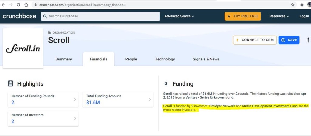 Newslaundry: Tienen una inversión directa del grupo Omidyar a través de su sucursal de Mauricio ON Mauritius. El fundador de Newslaundry, Shekri, también fue fundador de la ONG PCRF, en la que Kejriwal y Sisodia también fueron socios.