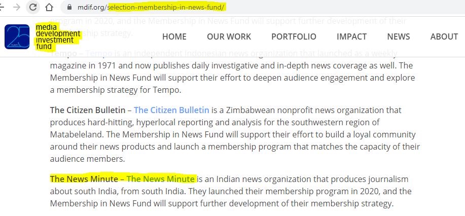 MDIF también financia The News Minute y Boom Live en la India. Así que están recibiendo fondos indirectos de Soros y Omidyar. Este MDIF y OFS están prohibidos en Rusia por este tipo de financiación a los creadores de propaganda.