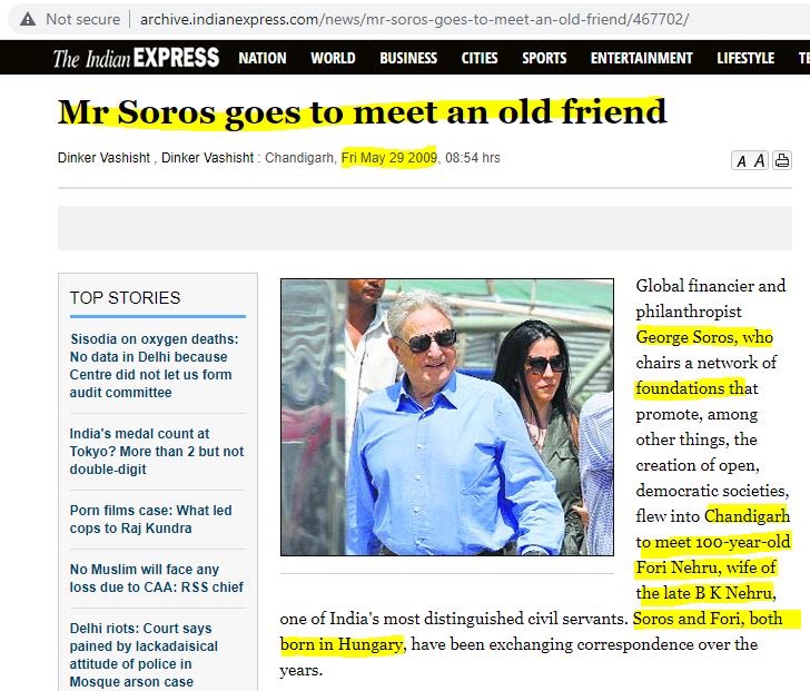 Soros era un viejo amigo de Fori Nehru. Fori (Shobha) Nehru era la esposa del primo de Indira Gandhi, B.K Nehru.