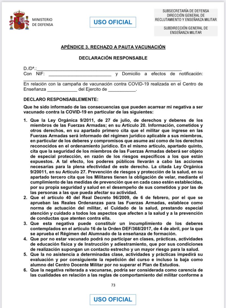 Pero aquellos que se niegan a recibir la vacuna, tienen que firmar un documento en el que se les informa de las consecuencias a las que se van a enfrentar por no inocularse, estipulado en la ITS 02/2021, de 5 de febrero, de la Inspección General de Sanidad sobre “Vacunaciones en las Fuerzas Armadas”. https://t.me/QAnons_Espana