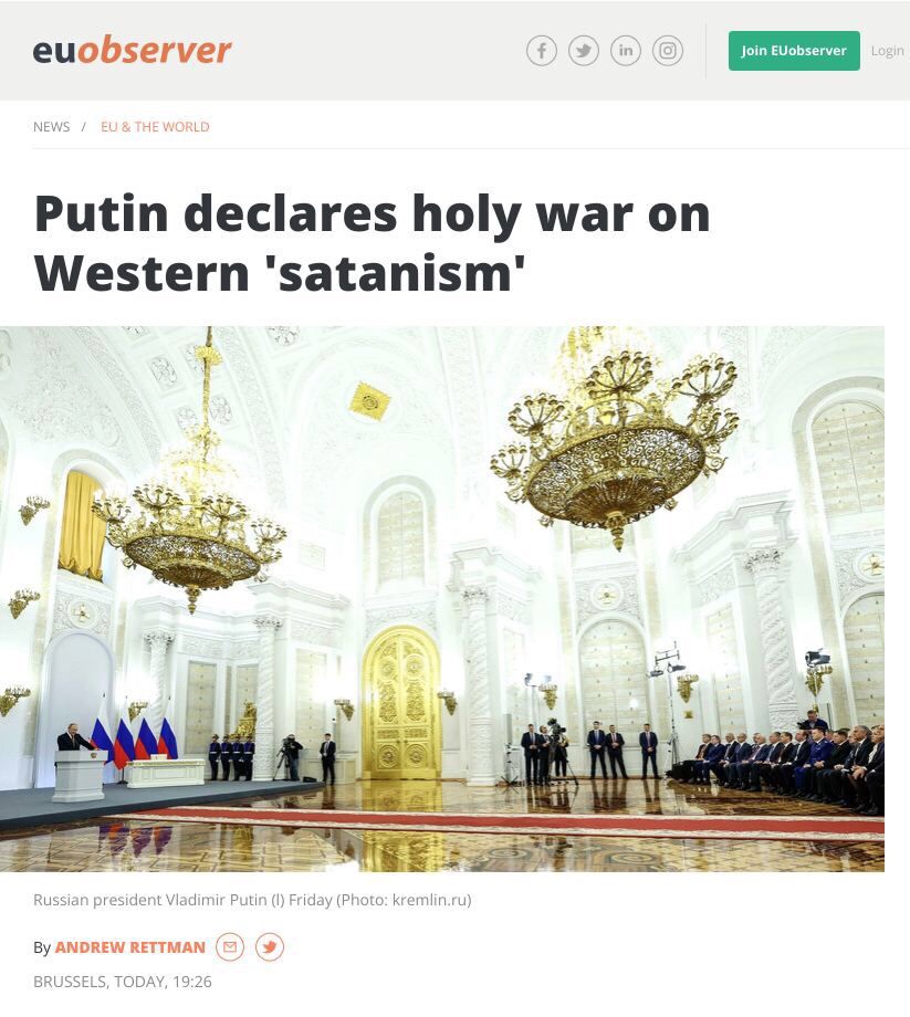 El presidente ruso, Vladimir Putin, invocó a Jesús, Satanás y los hombres del saco transexuales en una ceremonia en el Kremlin para dividir Ucrania el viernes (30 de septiembre). https://t.me/QAnons_Espana