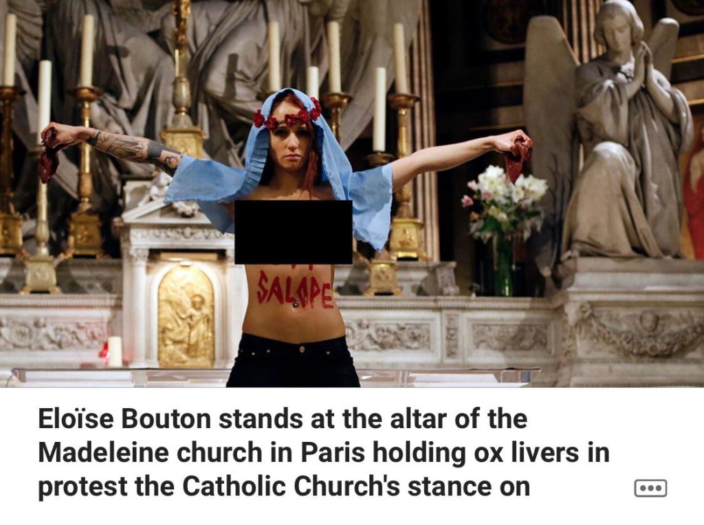 Eloïse Bouton tenía los senos desnudos y lemas a favor del derecho a decidir por todo el cuerpo cuando, en diciembre de 2013, interrumpió los villancicos en la famosa iglesia Madeleine de París y protestó contra las enseñanzas de la Iglesia católica contra el aborto simulando un aborto de Jesús.