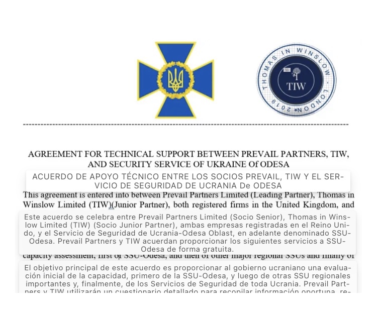 Después de algunas maniobras, el 18 de abril se elaboró un acuerdo provisional entre Prevail y su socio de implementación, una autodenominada «empresa de gestión de crisis con sede en Londres» llamada Thomas en Winslow. Según el contrato, Prevail llevaría a cabo una «evaluación de la capacidad» de las operaciones de Odessa-SSU, «entonces de otras grandes SSU regionales y finalmente de los Servicios de Seguridad de toda Ucrania», de forma gratuita.