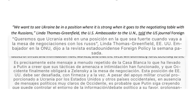 En una carta del 21 de septiembre a su círculo íntimo, Donnelly se preocupó de que la administración Biden no estuviera totalmente comprometida con la guerra total con Rusia. Citando declaraciones públicas de funcionarios de Washington que esperaban un acuerdo negociado entre Ucrania y Rusia, Donnelly declaró (ver más abajo): «Esta posición de los Estados Unidos debe ser impugnada, con firmeza y a la vez».