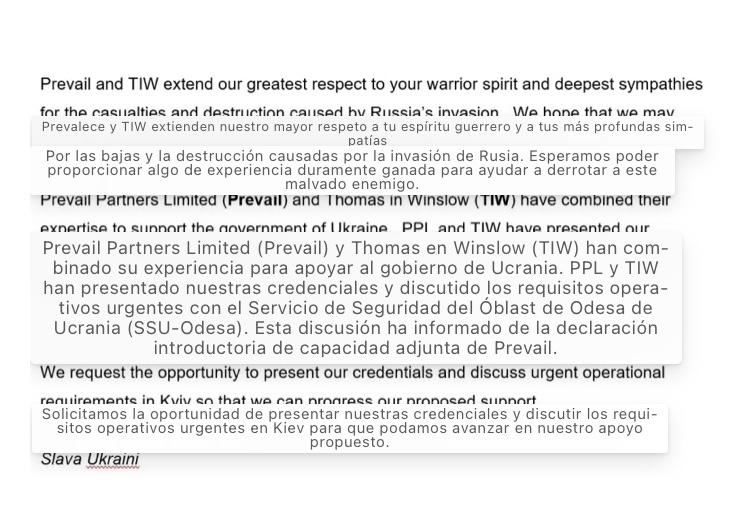 «Así es como Prevail está recibiendo donaciones de ONG/individuos privados para financiar equipos y bajos niveles de otro apoyo en este momento», explicó Hedges, señalando que Prevail también estaba discutiendo la financiación con la oficina del alcalde de Lviv, Andriy Sadovyi, uno de los oligarcas más ricos de Ucrania y propietario de la red de noticias Channel 24 del país