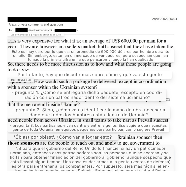 Dentro de la camarilla de Donnelly, también se plantearon preocupaciones sobre la propuesta inicial de Prevail. Alex Finnen, miembro de la célula espía de Inteligencia Militar del Grupo Especialista del Ejército Británico y de la sombría Unidad de Rusia del Ministerio de Relaciones Exteriores, comentó en un correo electrónico de finales de marzo que la oferta de Prevail era «muy cara por lo que es», con un costo previsto de 600.000 dólares por luchador partidista al año.