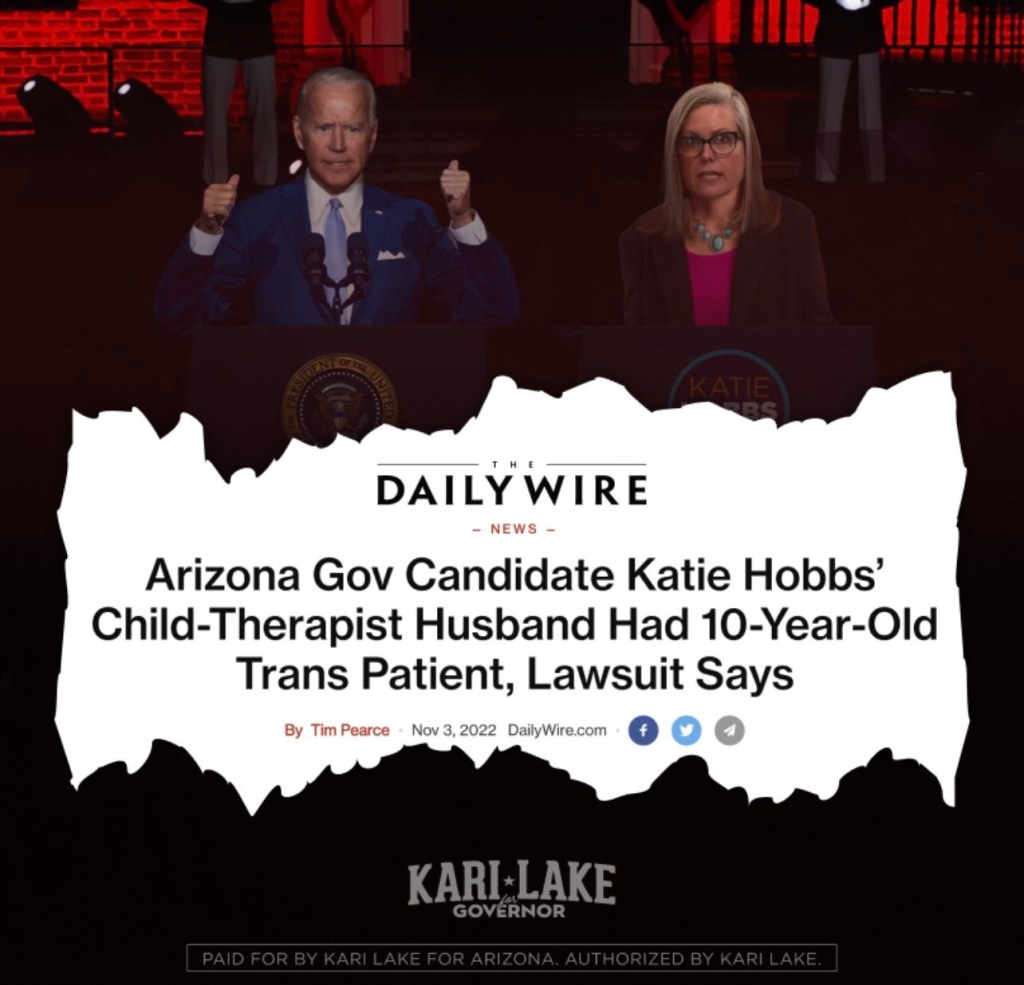 Si Katie Hobbs fuera la gobernadora de Arizona, probablemente anularía las nuevas leyes que protegen a los menores de la cirugía permanente que altera la vida, ayudando a su esposo a continuar con estas prácticas repugnantes.