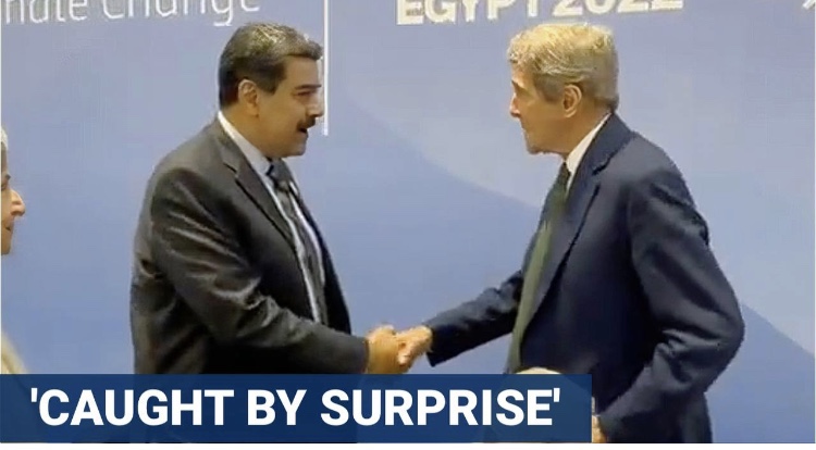 Kerry fue visto en vídeo reuniéndose brevemente con Maduro, el expresidente de Venezuela, en la reunión climática de la ONU de la COP27 en Sharm El-Sheikh, Egipto. El breve pero amistoso encuentro levantó las cejas en las redes sociales porque Maduro ha sido acusado por el gobierno de los Estados Unidos de narcoterrorismo, conspiración para importar cocaína y posesión de armas mortales.