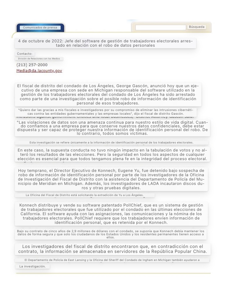 El mes pasado, los fiscales de Los Ángeles acusaron al Sr. Yu, el director ejecutivo de Konnech, una pequeña empresa de software electoral en Michigan, de almacenar datos sobre los trabajadores electorales en servidores en China, una violación del contrato de la compañía con el condado. Los cargos se relacionaron solo con los datos de los trabajadores electorales y no tuvieron ningún impacto en los votos o los resultados electorales.