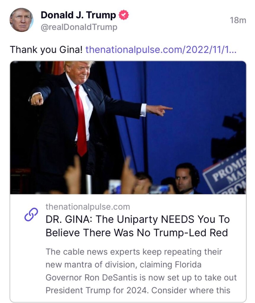 El movimiento Make America Great Again necesita una larga lista de sucesores de Trump. DeSantis podría ser absolutamente uno si solo puede ser paciente. Pero tratar de coronarlo rey del Partido Republicano un día después de que varios de sus candidatos respaldados perdieran (y donde Trump ganó 219 de 235 respaldos) realmente no funciona a favor de America First. https://t.me/QAnons_Espana
