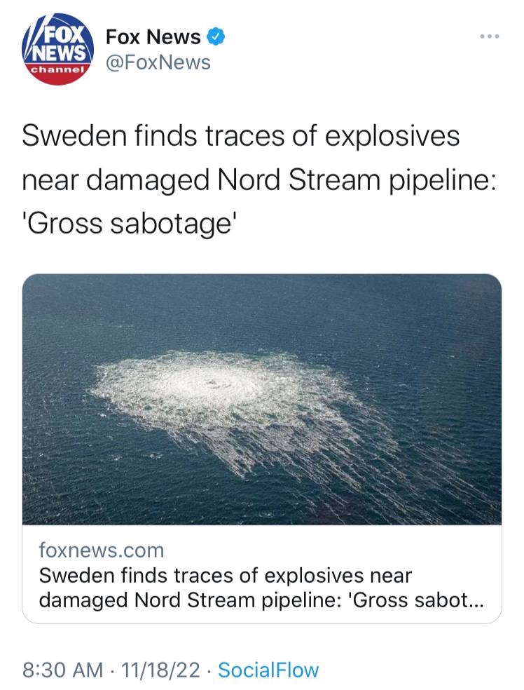 Las autoridades suecas encuentran evidencia de ‘sabotaje grave’ en los daños a las tuberías de Nord Stream. https://t.me/QAnons_Espana