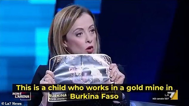 ‘Este es un niño que trabaja en una mina de oro en Burkina Faso. Burkina Faso es una de las naciones más pobres del mundo. Francia imprime dinero colonial para Burkina Faso, que tiene oro”, explicó Meloni.