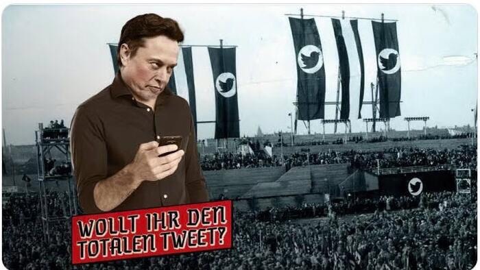 El Tweet dice: “¡Gracias a Elon Musk, puedes volver a decir cualquier cosa en Twitter! ¡Libertad total de expresión! #heuteshow”. El pie de foto, cuyo esquema de colores y fuente invoca la propaganda de la era nazi, dice «¿Quieres un tweet total?»