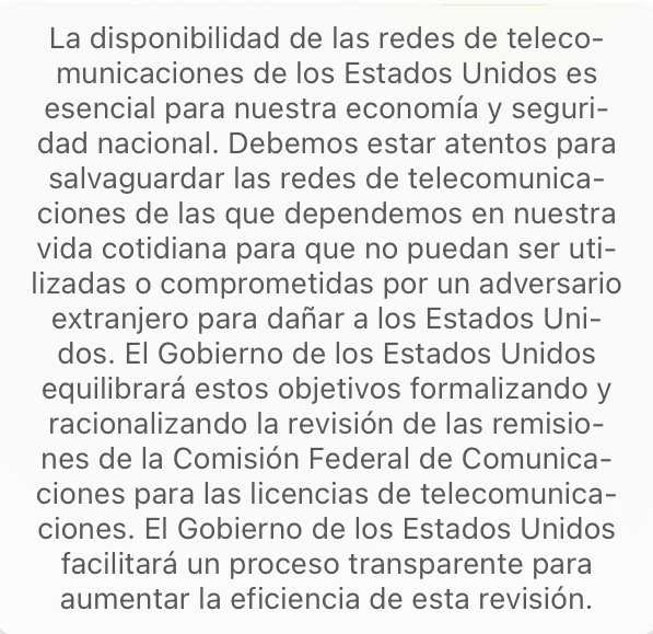«Estas nuevas reglas son una parte importante de nuestras acciones en curso para proteger al pueblo estadounidense de las amenazas a la seguridad nacional que implican las telecomunicaciones».