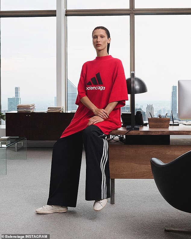 Bella Hadid en la campaña Primavera ’23 de Balenciaga por su colaboración con Adidas. Aún no ha comentado sobre los múltiples escándalos de imágenes de niños que envuelven a la marca.