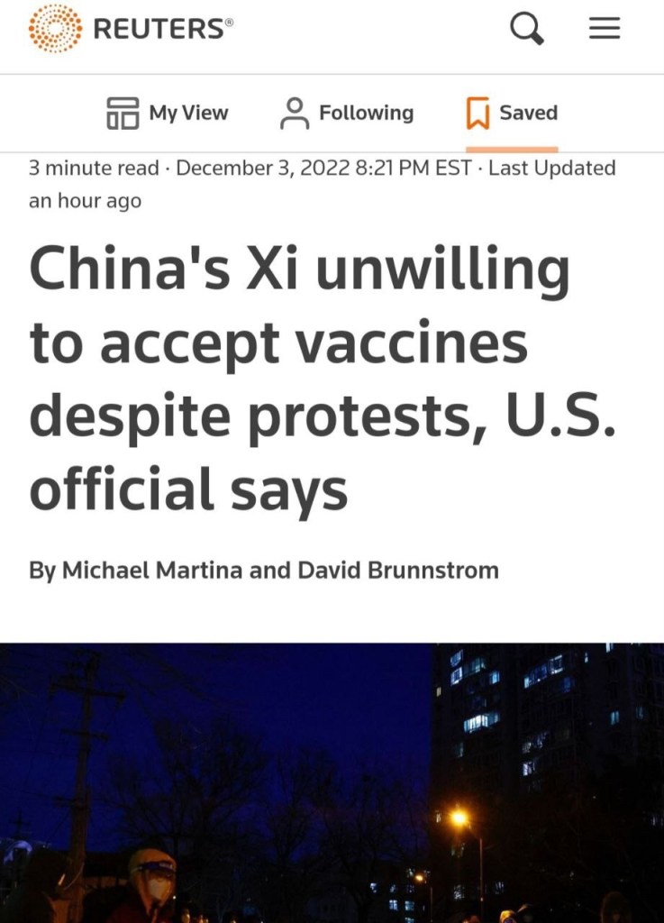 WASHINGTON, 3 de diciembre (Reuters) – El líder chino Xi Jinping no está dispuesto a aceptar las vacunas occidentales a pesar de los desafíos que China está enfrentando con la COVID-19, y aunque las recientes protestas no amenaza para el gobierno del Partido Comunista, podrían afectar su posición personal, EE. UU. La directora de Inteligencia Nacional, Avril Haines, dijo el sábado. https://t.me/QAnons_Espana