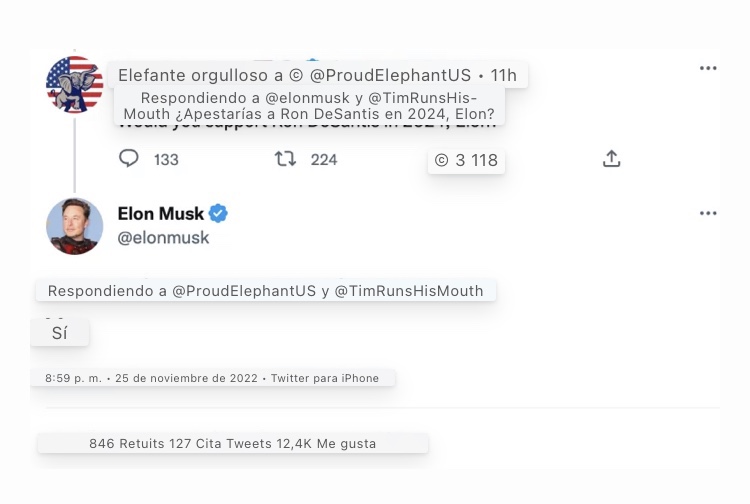 «¿Apyarías a Ron DeSantis en 2024, Elon?» Usuario de Twitter @ProudElephantUStweeted.
