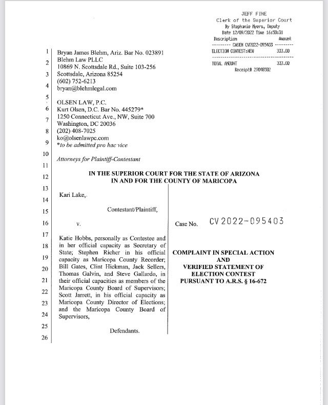 La denuncia alegó que el número de votos ilegales emitidos en las elecciones «excede con creces el margen de 17 117 votos» entre los dos candidatos, una diferencia del .67 por ciento. Dijo que la demócrata Katie Hobbs no recibió el mayor número de votos debido a votos ilegales.