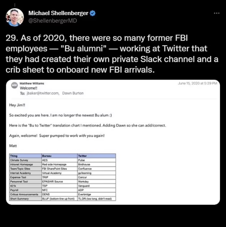 El lanzamiento de Twitter Files del lunes también mostró que muchos ex empleados del FBI se habían unido a la red de redes sociales, ahora había un canal privado de Slack creado solo para ellos.