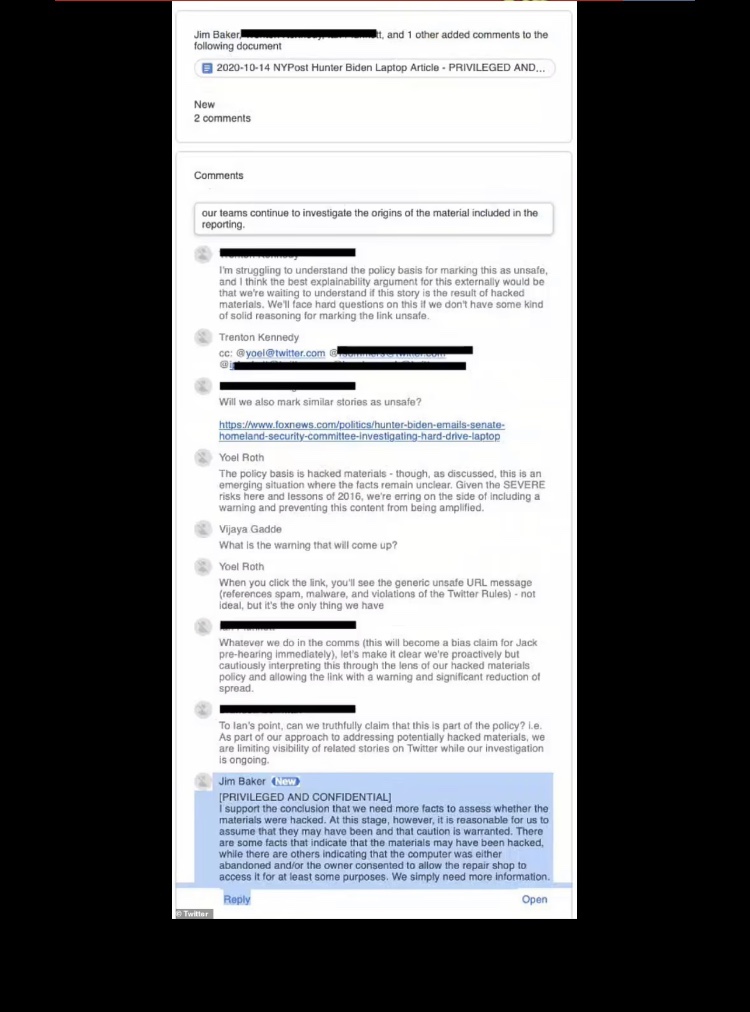Como resultado de esos esfuerzos, Twitter bloqueó el reportaje de The New York Post sobre la historia en el sitio web de redes sociales. Al final del proceso, los últimos archivos de Twitter revelaron que Baker y su equipo acordaron firmar una carta a los agentes del FBI que trabajaron en el proyecto, agradeciéndoles sus esfuerzos.