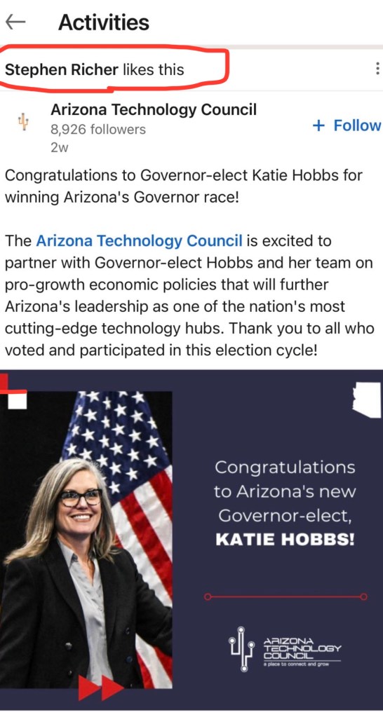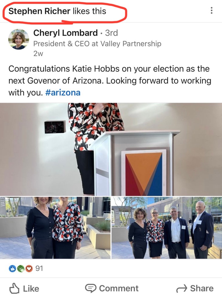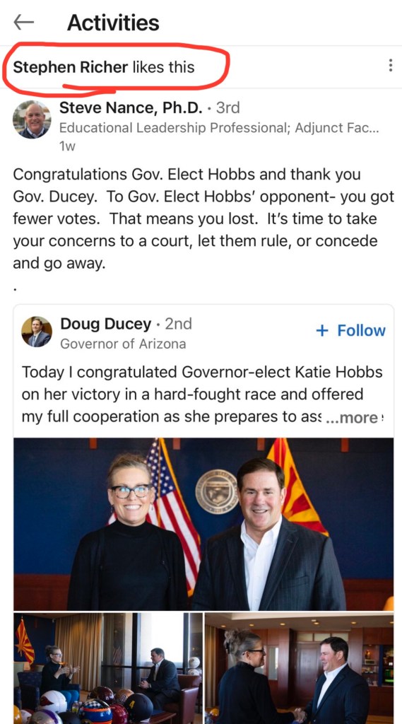 También se vio a Stephen Richer dándole me gusta a las publicaciones de LinkedIn, celebrando los resultados electorales amañados y diciéndole a Kari Lake que «se fuera».