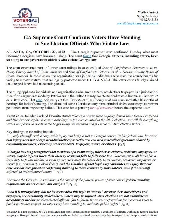 El caso fue los Hijos de Veteranos Confederados et al. contra la Junta de Comisionados del Condado de Henry. El caso fue utilizado originalmente por el Tribunal de Apelaciones de Georgia para desestimar el caso de votación de VoterGA en el condado de Fulton. Sin embargo, el caso de los Hijos de los Veteranos Confederados terminó en la Corte Suprema de Georgia, donde la opinión citada anteriormente concedió a los votantes la posibilidad de demandar como miembros de la comunidad con una queja generalizada.