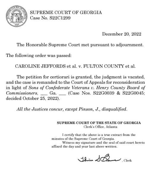Hoy, la Corte Suprema de Georgia concedió una petición de certiorari y anuló la sentencia anterior en Jeffords et al. v. Condado de Fulton et al.