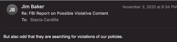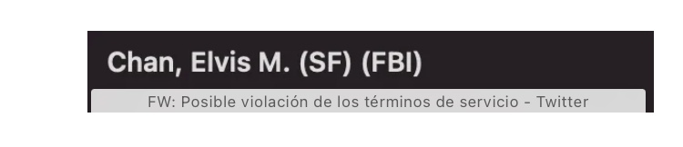 25. El FBI estaba adaptando claramente las búsquedas a las políticas de Twitter. Las solicitudes del FBI casi siempre se expresaban como «posible violación de los términos de servicio» en algún lugar, incluso en la línea de asunto: