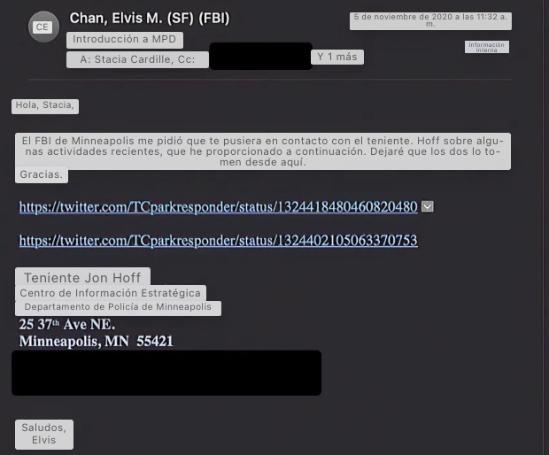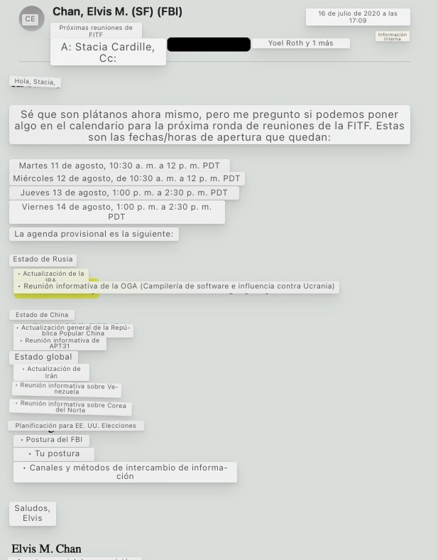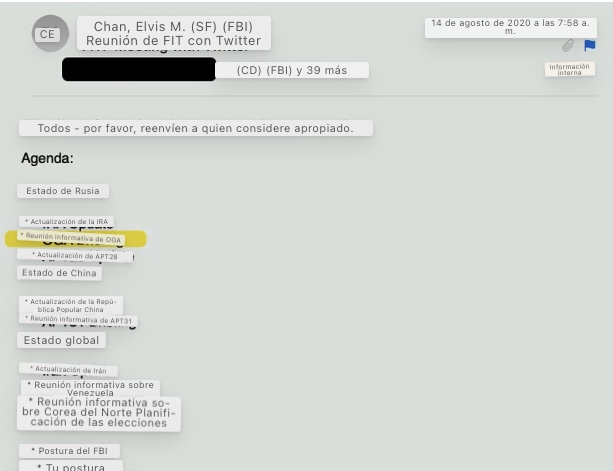 7. El 29 de junio de 2020, el agente del FBI de San Francisco, Elvis Chan, escribió a un par de ejecutivos de Twitter preguntando si podía invitar a un «OGA» a una próxima conferencia patrocinada por ONG: