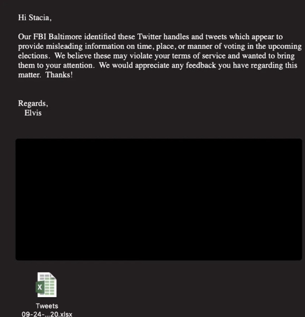 22. Especialmente a medida que se acercaban las elecciones en 2020, el FITF/FBI abrumó Twitter con solicitudes, enviando hojas de cálculo con cientos de cuentas: