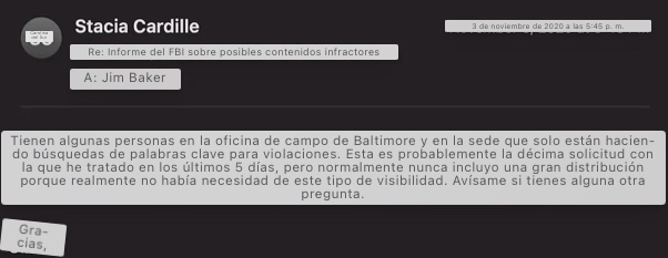 - «Tienen algunas personas en la oficina de campo de Baltimore y en la sede que solo están haciendo búsquedas de palabras clave para violaciones. Esta es probablemente la décima solicitud con la que he tratado en los últimos 5 días», comentó Cardille.