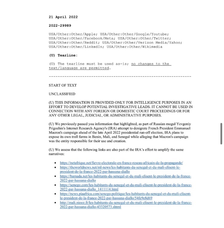 - Un informe de inteligencia enumera cuentas vinculadas a la «propaganda ‘neonazí’ de Ucrania'». Esto incluye afirmaciones de que Joe Biden ayudó a orquestar un golpe de estado en 2014 y «poner a su hijo en la junta de Burisma».