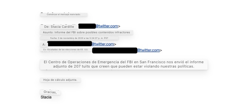 - Los ejecutivos de Twitter se dieron cuenta de que el FBI parecía estar asignando personal para buscar violaciones de Twitter.