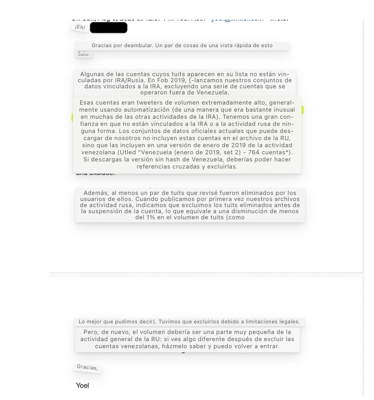 35. En otro caso, Roth concluye que una serie de cuentas pro-Maduro venezolanas no están relacionadas con la Agencia de Investigación de Internet de Rusia, porque tienen un volumen demasiado alto: