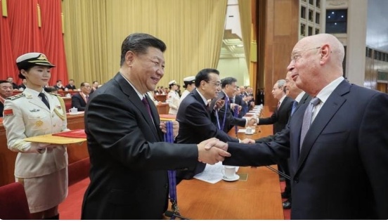 A través de su fundador Klaus Schwab y las organizaciones asociadas, el FEM tiene una relación muy acogedora con el gobierno chino. Davos reveló recientemente que su oficina en China ahora tiene 40 empleados a tiempo completo. Además, cada año en Beijing, el WEF organiza su «Reunión Anual de los Nuevos Campeones«, que facilita las asociaciones entre las empresas internacionales y el Partido de la Comunidad China. En 2018, el PCCh otorgó a Klaus Schwab su Medalla de Amistad de la Reforma de China, una medalla para los no chinos que hacen las ofertas del PCCh en el extranjero.
