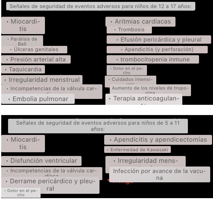 - Hay 96 señales de seguridad para niños de 12 a 17 años, que incluyen: miocarditis, pericarditis, parálisis de Bell, ulceraciones genitales, presión arterial alta y frecuencia cardíaca, irregularidades menstruales, incompetencias valvulares cardíaca, embolia pulmonar, arritmias cardíacas, trombosis, derrame pericárdico y pleural,