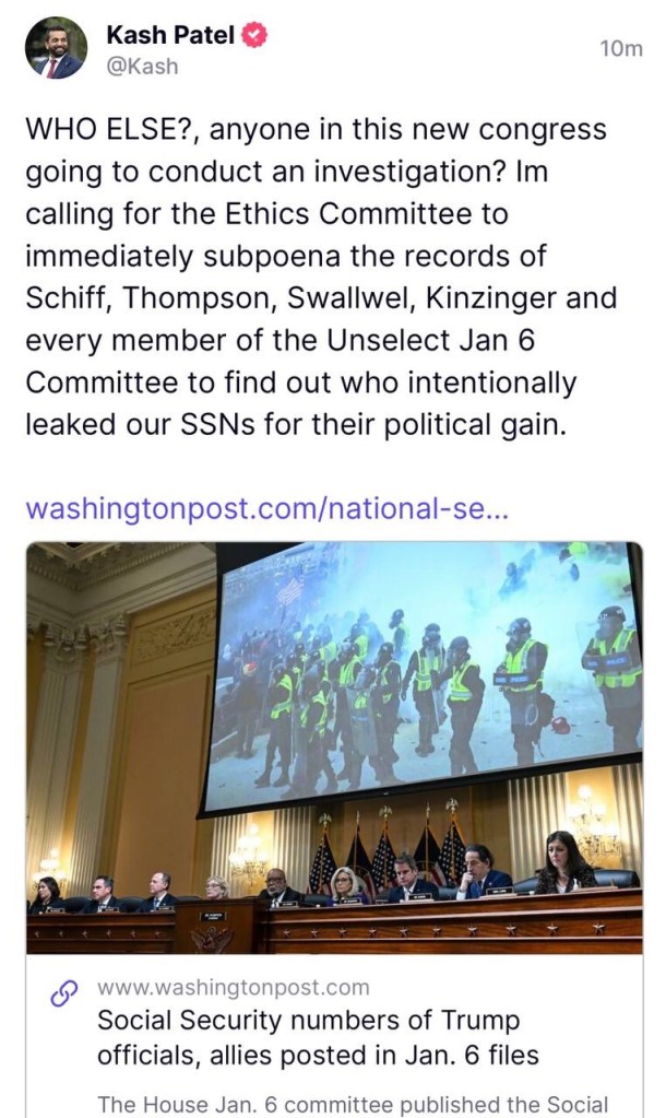 Un portavoz de Thompson, el presidente del comité, no hizo comentarios. El ex congresista Adam Kinzinger (R-Ill.), miembro del comité, dijo que no estaba al tanto de la divulgación de los números de Seguro Social y que no sabía cómo sucedió. https://t.me/QAnons_Espana