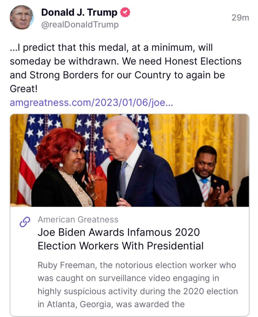 Ruby Freeman, la notoria trabajadora electoral que fue captada en un video de vigilancia participando en actividades altamente sospechosas durante las elecciones de 2020 en Atlanta, Georgia, recibió la Medalla Presidencial de Ciudadanos en la Casa Blanca el viernes. https://t.me/QAnons_Espana