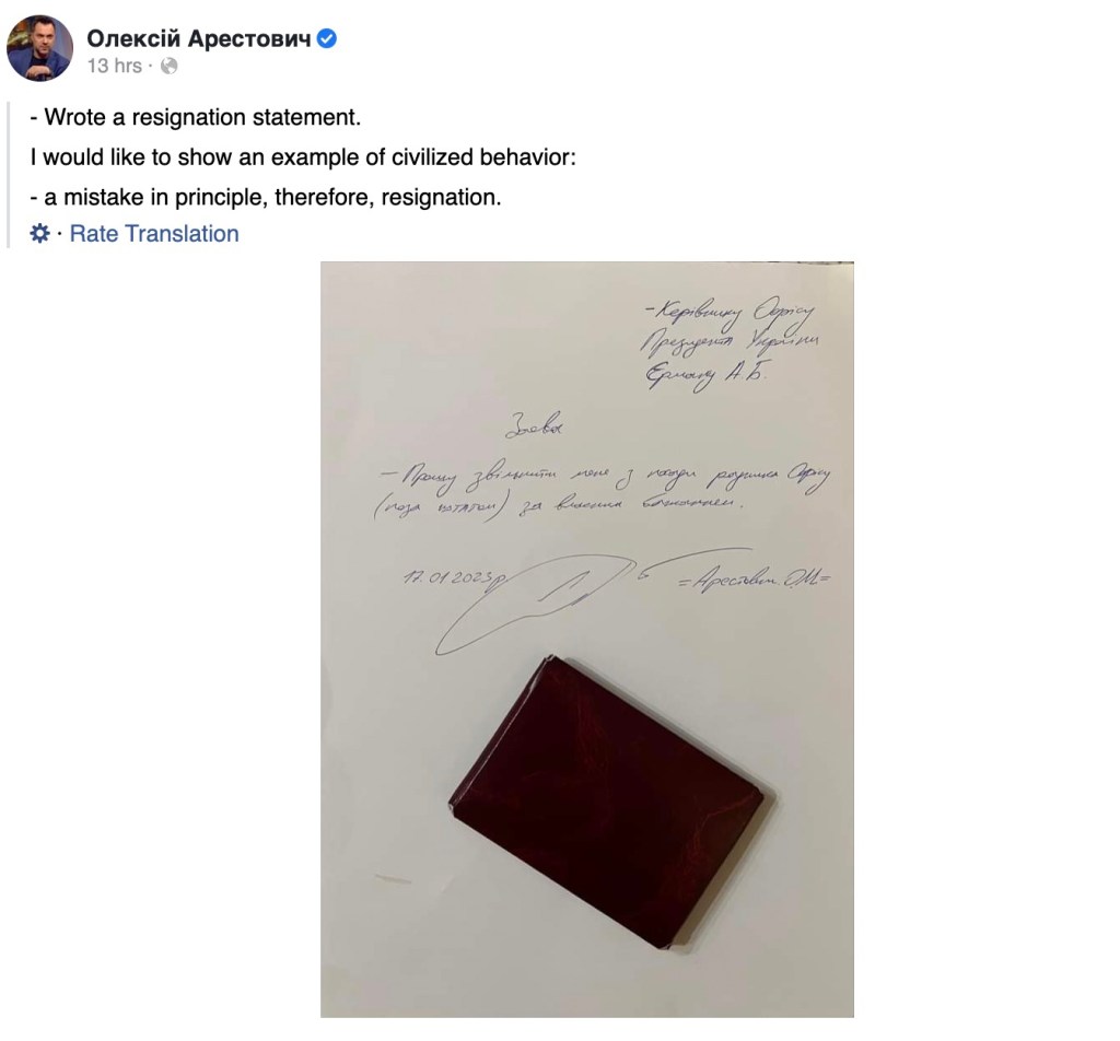 En su página de Facebook, Arestovych compartió una imagen de su carta de renuncia.