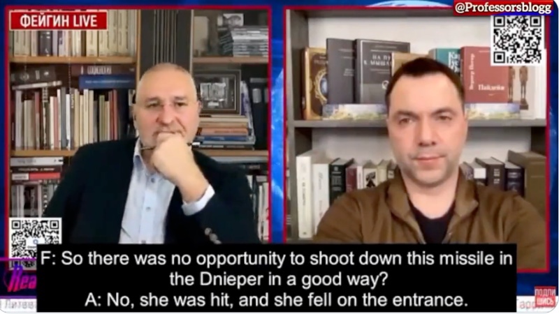 A medida que llegaron informes durante el fin de semana de que Rusia había atacado un edificio de apartamentos en Dnipro, Arestovych dio una entrevista diciendo que el misil fue derribado por la defensa aérea ucraniana, cuando aterrizó y detonó en el edificio. Esos misiles tierra-aire fueron suministrados a Ucrania por los Estados Unidos en noviembre.