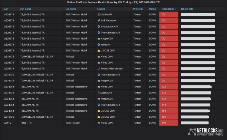 Los datos de la red confirman la restricción de Twitter en múltiples proveedores de Internet en Turquía a partir del miércoles 8 de febrero de 2023. El incidente se produce cuando las autoridades plantean preocupaciones sobre la desinformación en línea, aunque no se ha proporcionado una explicación formal. El servicio se restableció a la mañana siguiente después de que los medios estatales informaran que las autoridades turcas habían celebrado una reunión con el jefe de política de Twitter sobre desinformación y la necesidad de eliminación de contenido.