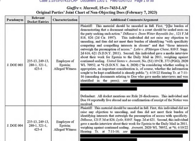 Los abogados de Maxwell se opusieron firmemente a la publicación de cualquier material relacionado con J. Doe 36, que se describe como un «afiliado de Epstein».
