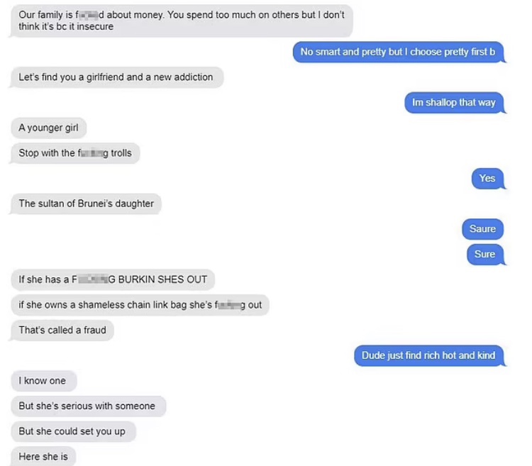- Los textos obtenidos por DailyMail.com muestran que Hunter, de 53 años, le pidió a su prima Caroline que lo pusiera en contacto con Nicola Peltz, de 28 años, que se casó con Brooklyn Beckham el año pasado