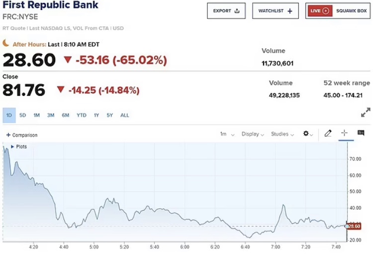 Los principales bancos estadounidenses también se supusieron afectados a medida que los temores de contagio se extendieron por todo el sector, con Wells Fargo cayendo en picado un 7,5 por ciento, Bank of America cayendo un 7,4 por ciento, Citigroup cayendo un 5,8 por ciento y JP Morgan cayendo un 2,7 por ciento.